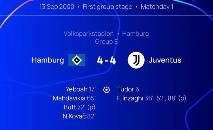 有数据统计称,上次尤文在欧冠与对手踢出4-4的比分还要追溯到25年前,2000年9月13日客场对阵汉堡,因扎吉上演帽子戏法并在第88分钟打进绝平点球。